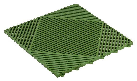 The tiles are available in green, red and grey and are designed to interlock. Each tile measures 400mm x 400mm x 18mm (15¾'' x 15¾'' x ¾''). The tiles can be used on their own or together with a range of accessory items to create sloped edges for a completely finished look.