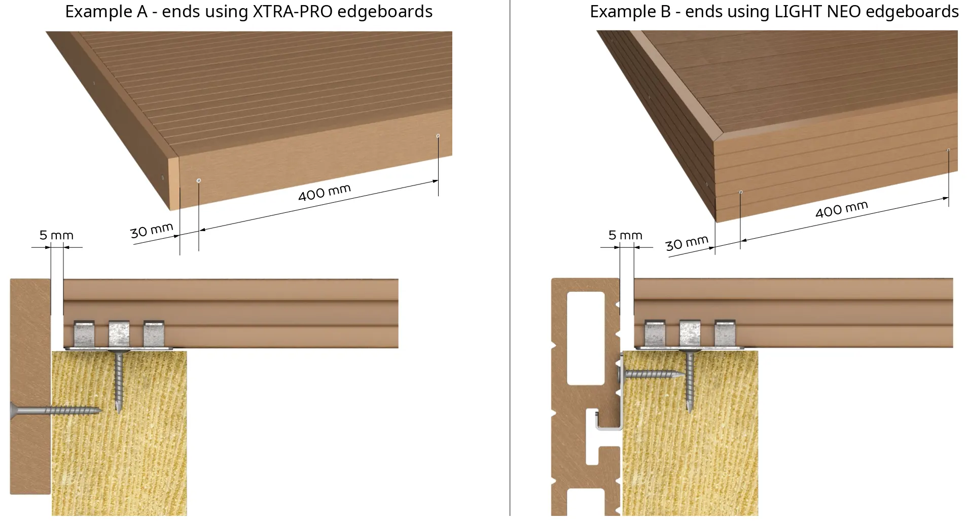 Fixing screws must be used every 400mm. The joints of an edgeboard must have a 5mm space and the minimum distance of a fixing screw from the edge must be 30mm.