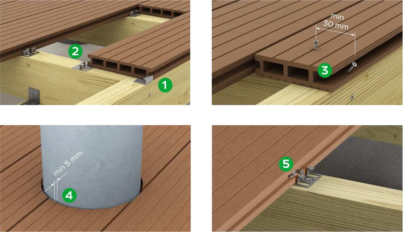 Outermost beams should be installed so that the decking board does not extend more than 30mm beyond the edge of the beam.