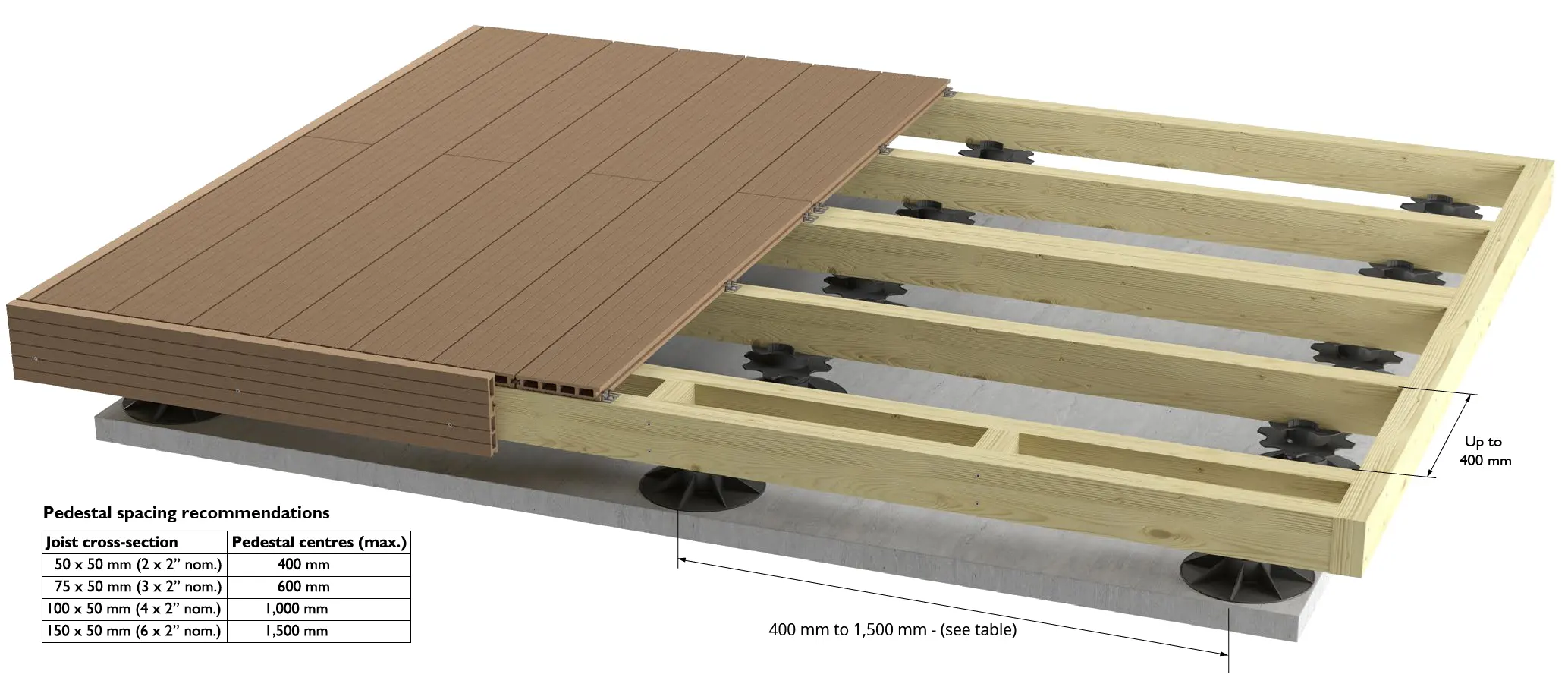 For aluminium and composite plastic beams supported by pedestals, we recommend spacing supports 500mm apart.